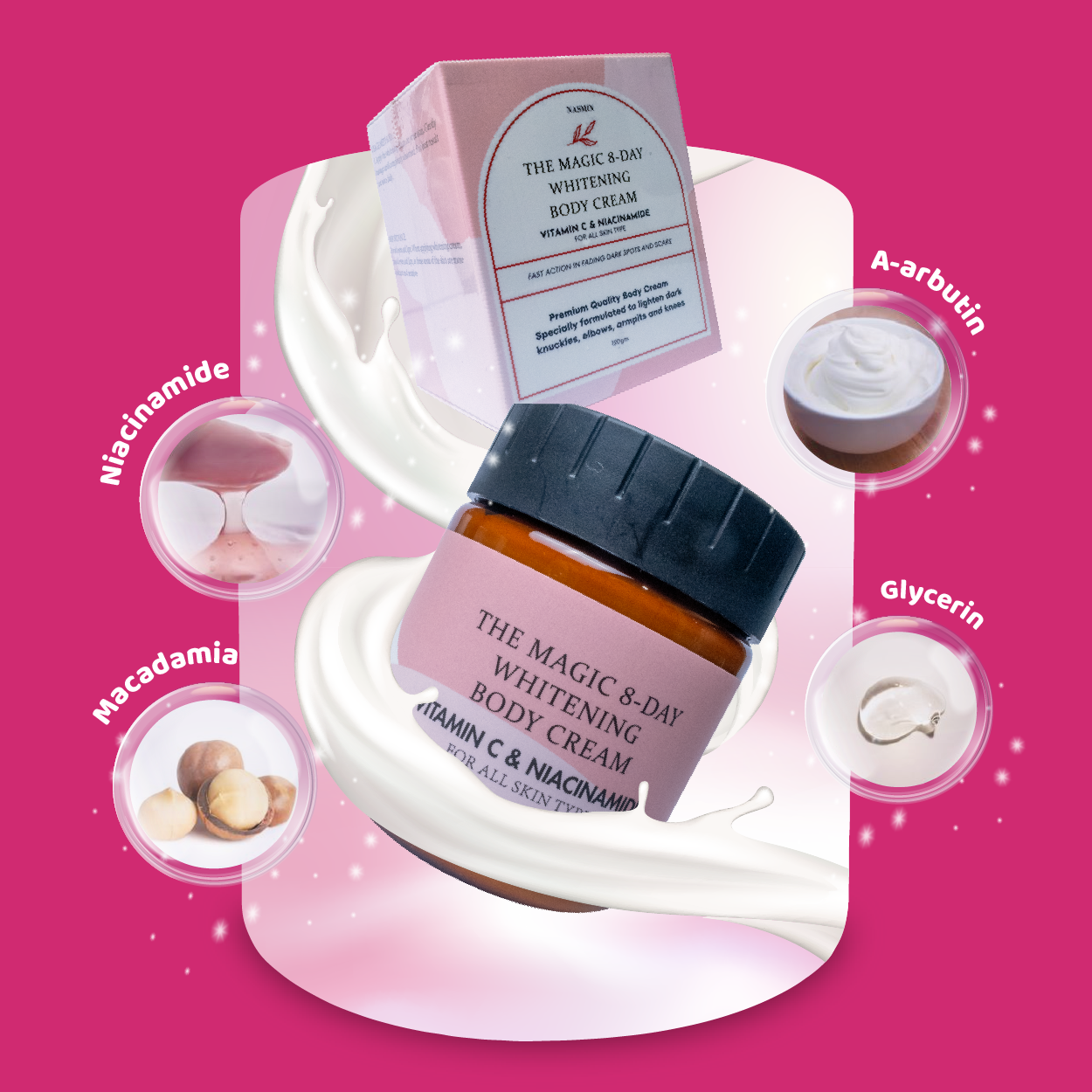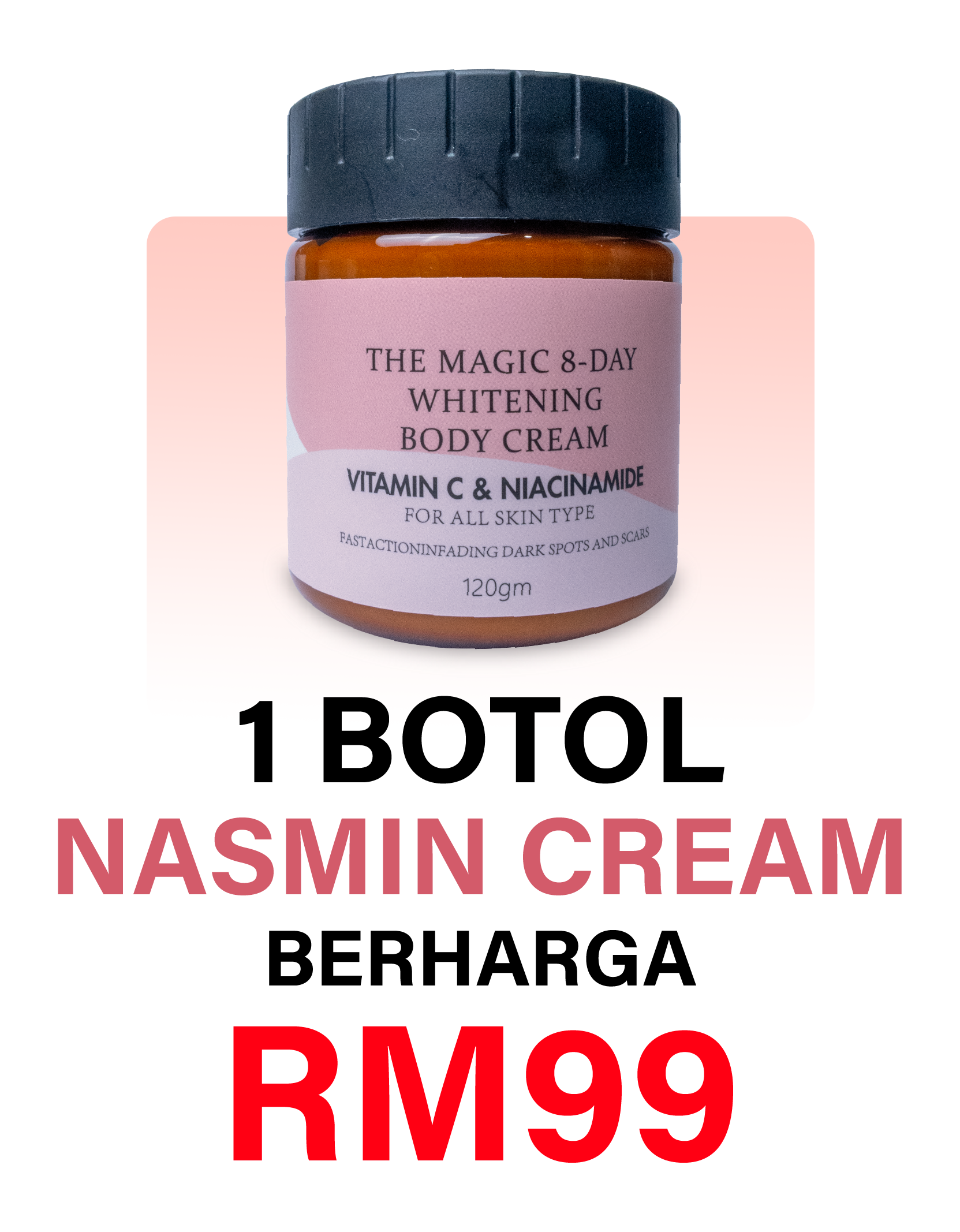 Kandungan sebotol Nasmin Magic 8-Day Whitening Body Cream adalah 120gram.